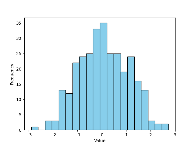 ヒストグラムを表示するには、pyplot.hist() 関数を用います。ヒストグラムではデータの他に、区間(ビン)の数(bins)やビンの色(color, edgecolor)を指定することができます。