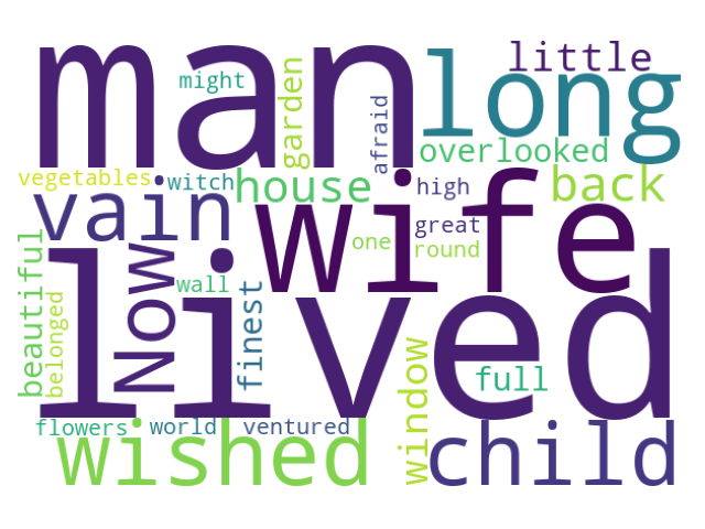 text = "There once lived a man and his wife, who had long wished for a child, but in vain. Now there was at the back of their house a little window which overlooked a beautiful garden full of the finest vegetables and flowers; but there was a high wall all round it, and no one ventured into it, for it belonged to a witch of great might, and of whom all the world was afraid."